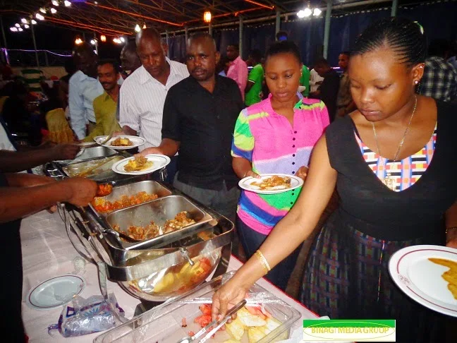 Wageni waalikwa wakijipatia Maakuri katika hafla ya kumuaga aliekuwa Mkurugenzi Mtendaji wa Nyanza Bottling Company baada ya kustaafu.