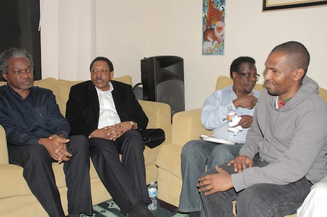 Wapili toka kushoto ni Balozi wa Tanzania nchini Marekani Mhe. Wilson Masilingi akitoa pole kwa Madaraka Nyerere ( wakwanza kushoto) mume wa marehemu Leticia Nyerere nyumbani Lanham, Maryland nchini Marekani siku ya Jumatatu January 11, 2016. Wengine kwenye picha ni Emmanuel Muganda na Mwenyekiti wa CHADEMA DMV Kalley Pandukizi (kulia).