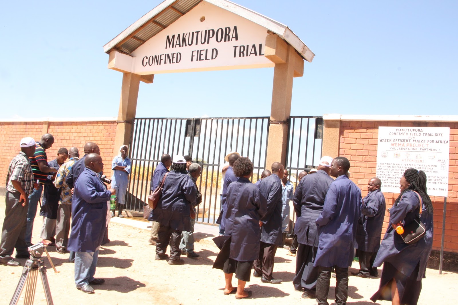 Wanahabari wakiwa nje ya lango kuu la kuingia katika shamba la majaribio la mahindi yaliyotokana na teknolojia ya GMO la Makutupora mkoani Dodoma wakisubiri taratibu za kuingia kwenye shamba hilo.